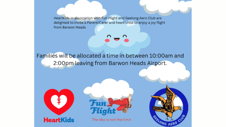 It will be held on 20th October at Barwon Heads airport from 10:00am-2:00pm. It is available to the heart child and parent/carer. Spots are very limited (only 40) and will fill up very fast.
