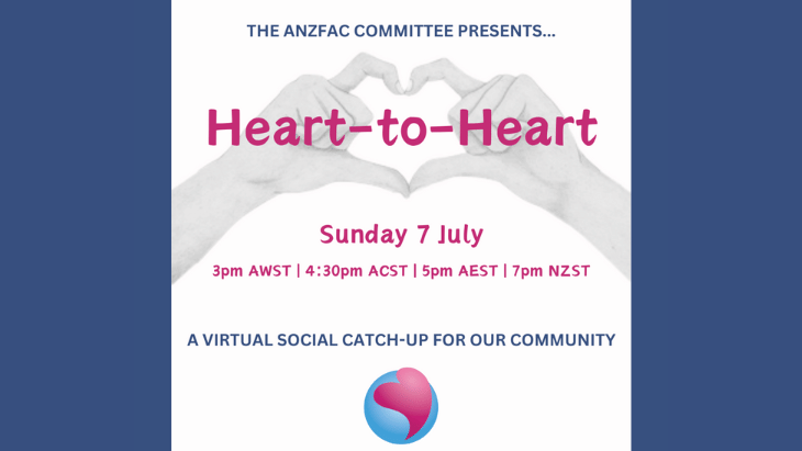 THE ANZFAC Committee cordially invites you to their next virtual social catch-up! This is a great opportunity to meet other members of the Fontan community. The main topic of conversation will be HEART-TO-HEART (navigating relationships with a Fontan).